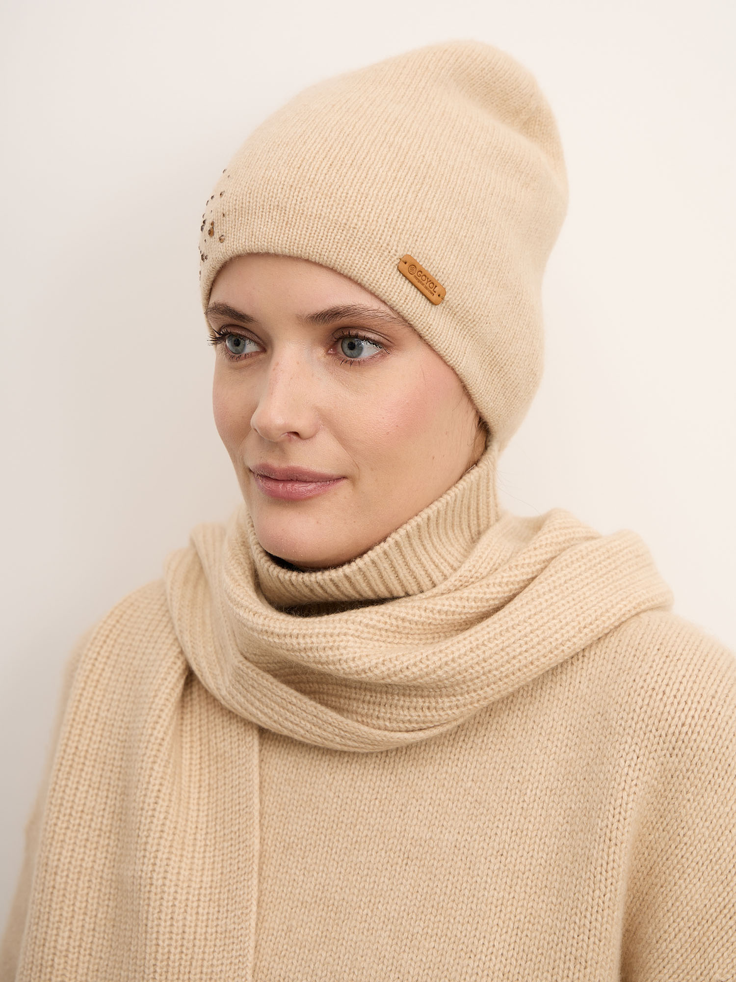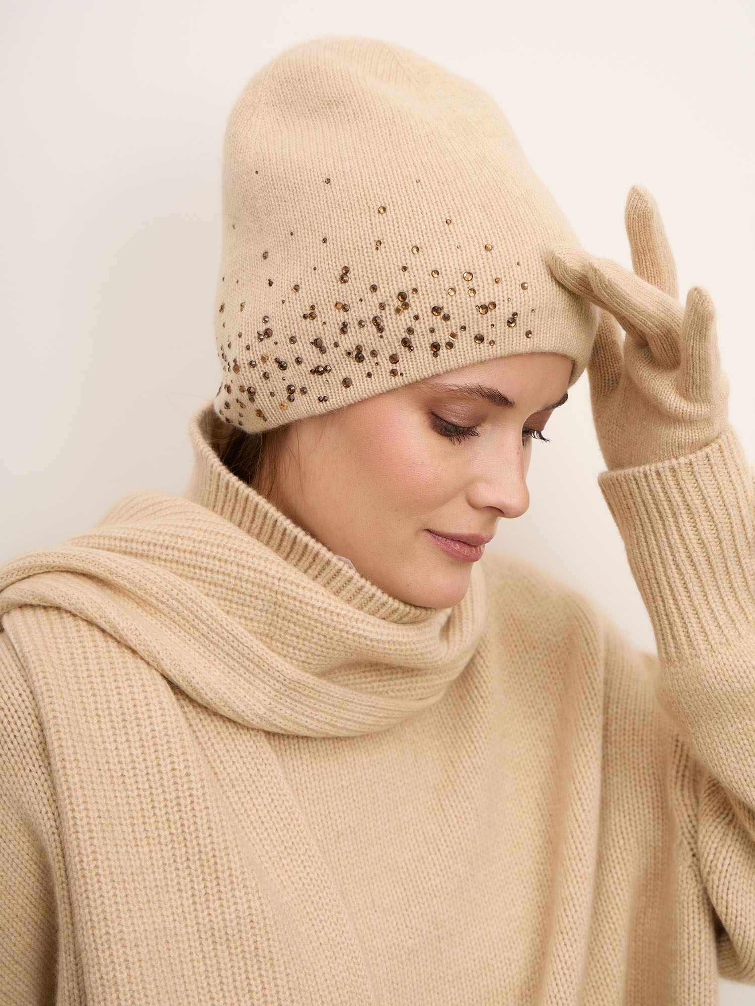 Шапка выполнена из мягкого кашемирового трикотажа, который приятно прилегает к коже, не вызывает раздражения и сохраняет тепло даже в ветреную погоду. Украшение из мелких страз у нижнего края создаёт лёгкий блеск, который красиво переливается на свету. Эластичная структура изделия обеспечивает комфортную посадку и идеальную форму.