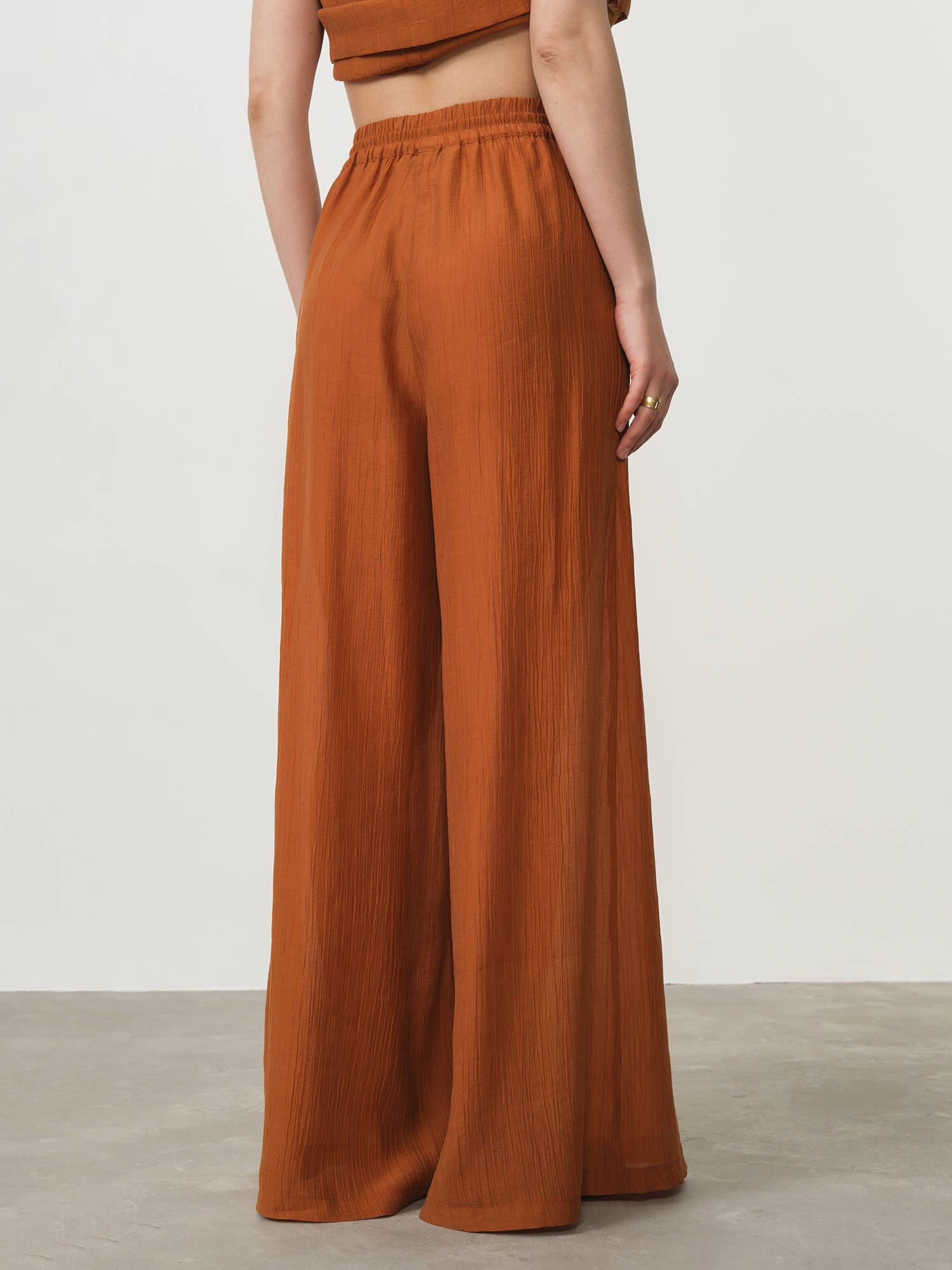 Экологичность лиоцелла делает эту модель ответственным выбором — производство требует меньше воды и энергии по сравнению с хлопком. Ткань устойчива к сминанию и сохраняет насыщенный цвет после множества стирок. Выберите эти брюки — пусть их теплый терракотовый оттенок и непревзойденный комфорт вдохновят вас на создание стильных образов с заботой о природе.