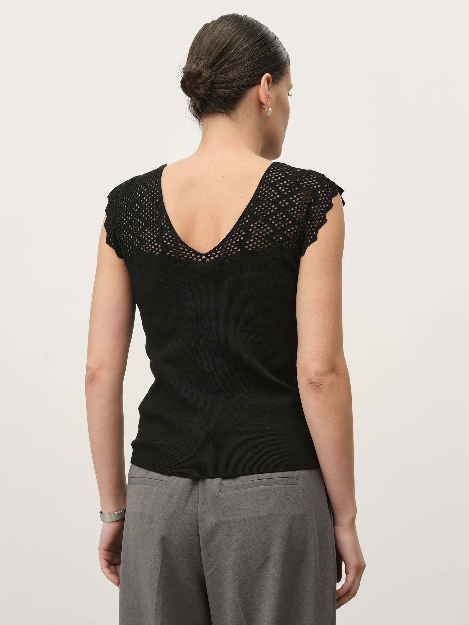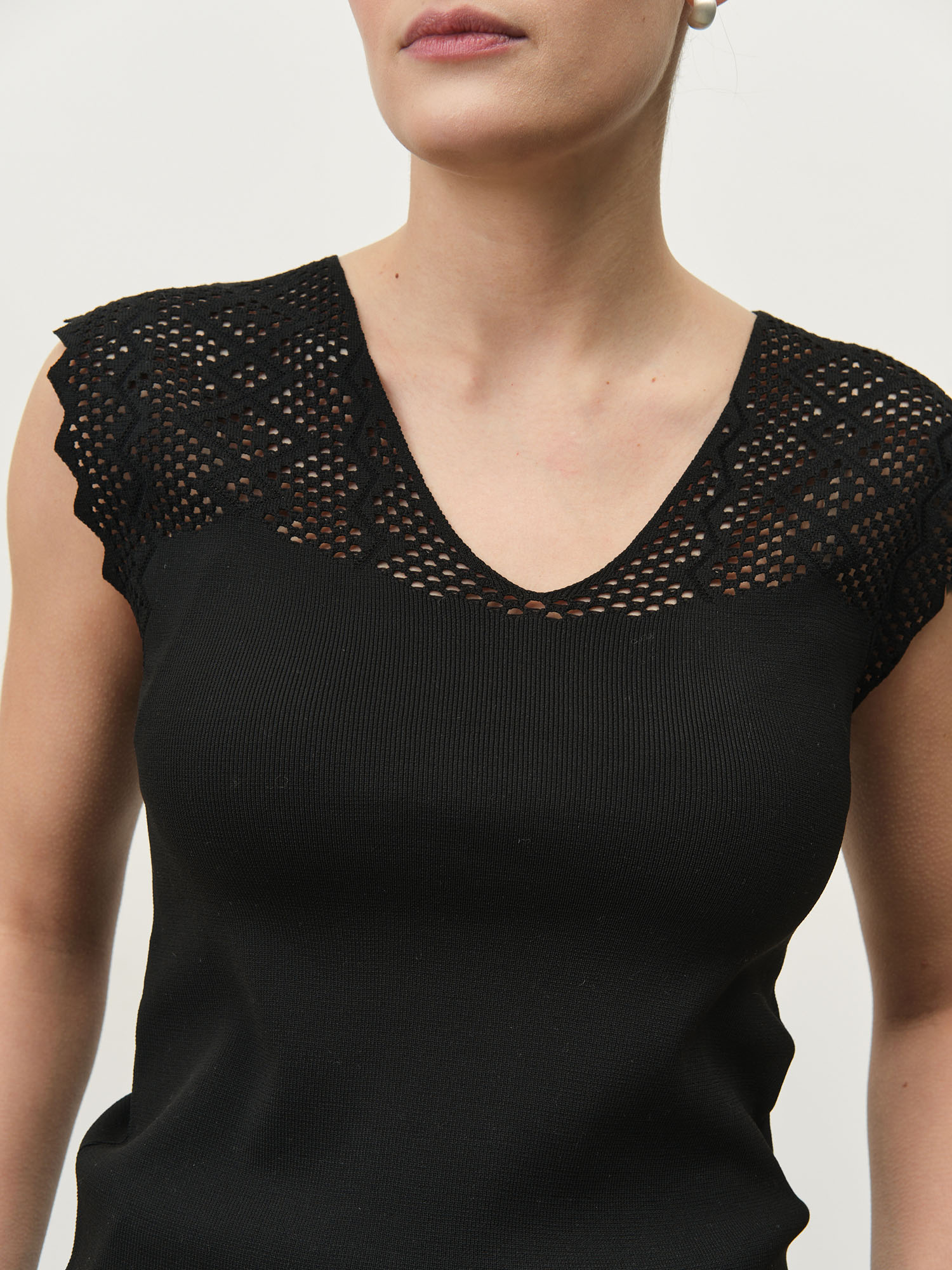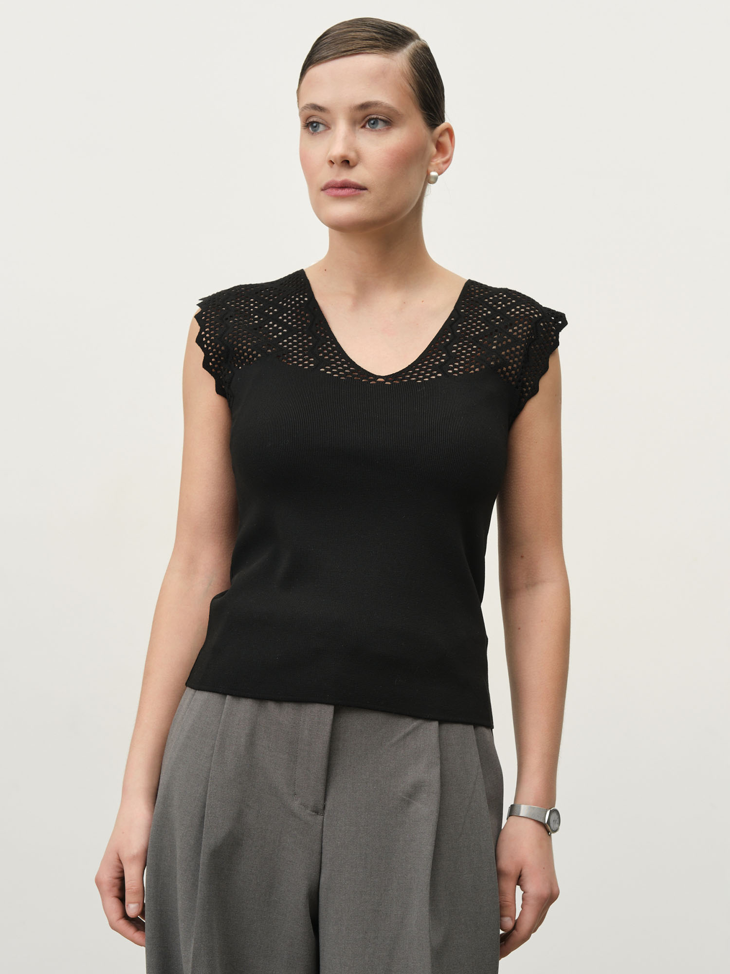 Приталенный силуэт с V-образным вырезом, подчёркивающим линию шеи. Ажурная вязка в верхней части добавляет модели лёгкость и изысканность.