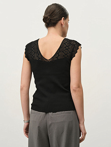 Короткий рукав с декоративным ажурным краем, эластичная структура ткани, аккуратная обработка, комфортная посадка по фигуре.
