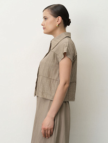 Свободный крой с укороченными рукавами и отложным воротником. Модель дополнена ярусной конструкцией, придающей объём и динамику.