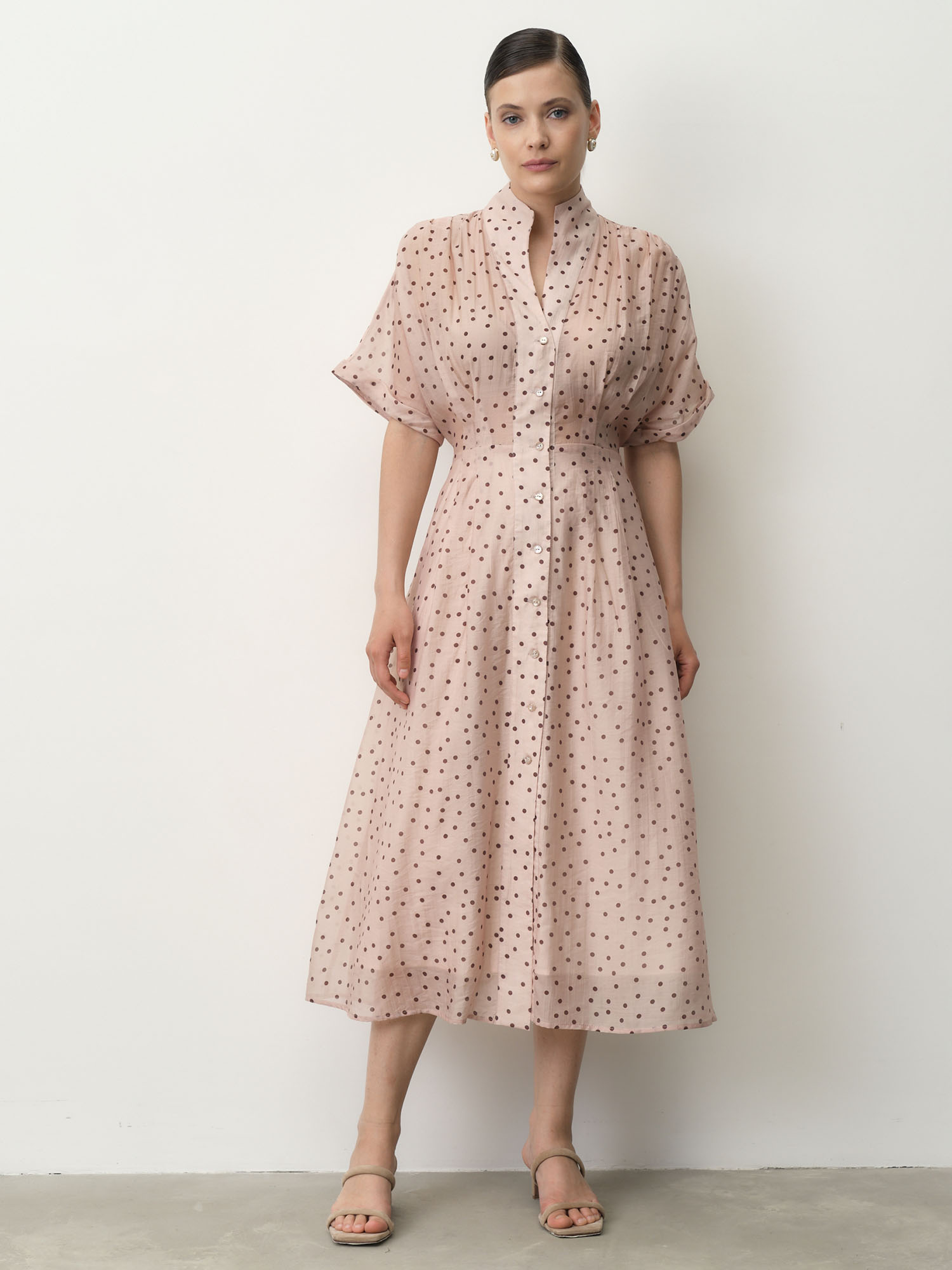 Пудровый в горошек — нежное и утонченное сочетание, придающее образу легкость и романтичность.