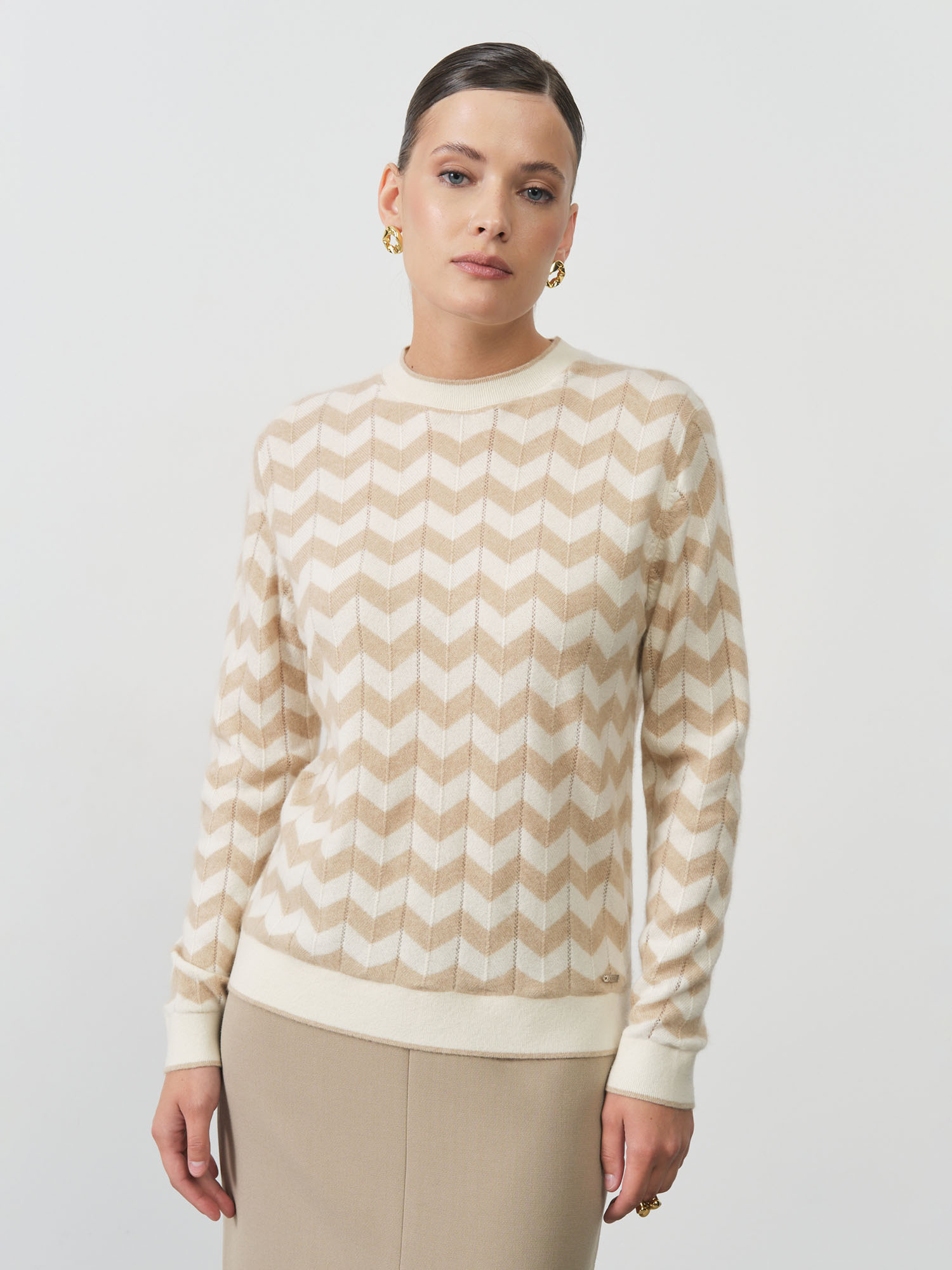 Благородный нейтральный оттенок делает эту модель универсальной основой гардероба. Джемпер одинаково органично смотрится с деловыми костюмами, создавая элегантный офисный образ, и с джинсами для повседневных прогулок. Полуприлегающий крой мягко обрисовывает силуэт, сохраняя при этом комфортную свободу движений, а классический вырез горловины добавляет образу завершенность.