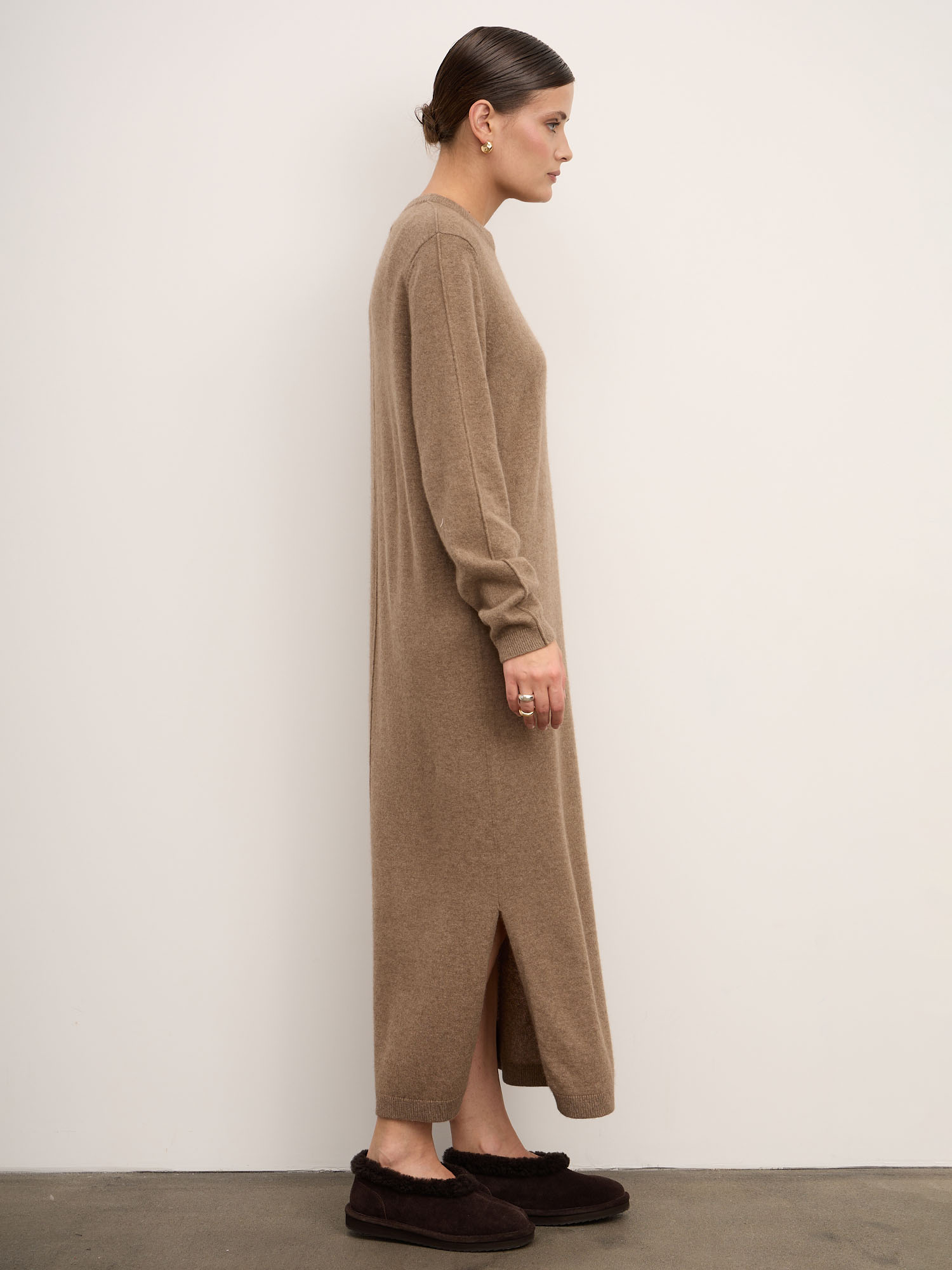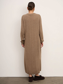 Платье выполнено в лаконичном прямом крое с длинными рукавами и округлым вырезом горловины. Эластичная вязка обеспечивает идеальную посадку и комфорт в движении. Натуральный оттенок капучино подчёркивает природную эстетику кашемира, делая образ мягким и женственным.