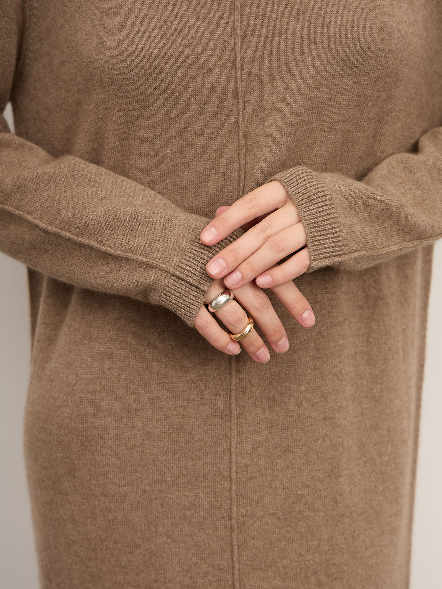 Платье из 100% кашемира в оттенке капучино — это гармония комфорта, тепла и минималистичной элегантности, созданная для тех, кто ценит натуральные материалы и спокойный стиль.