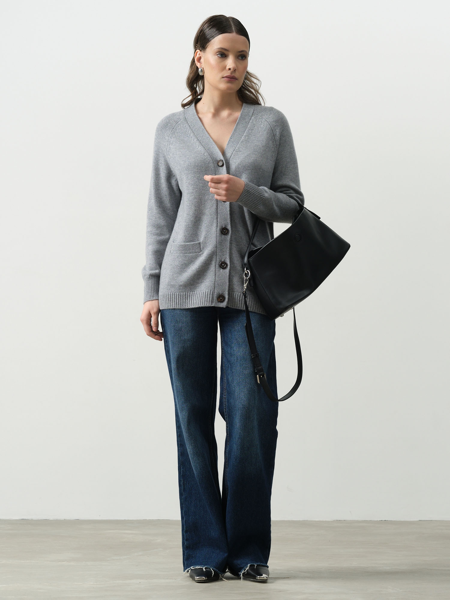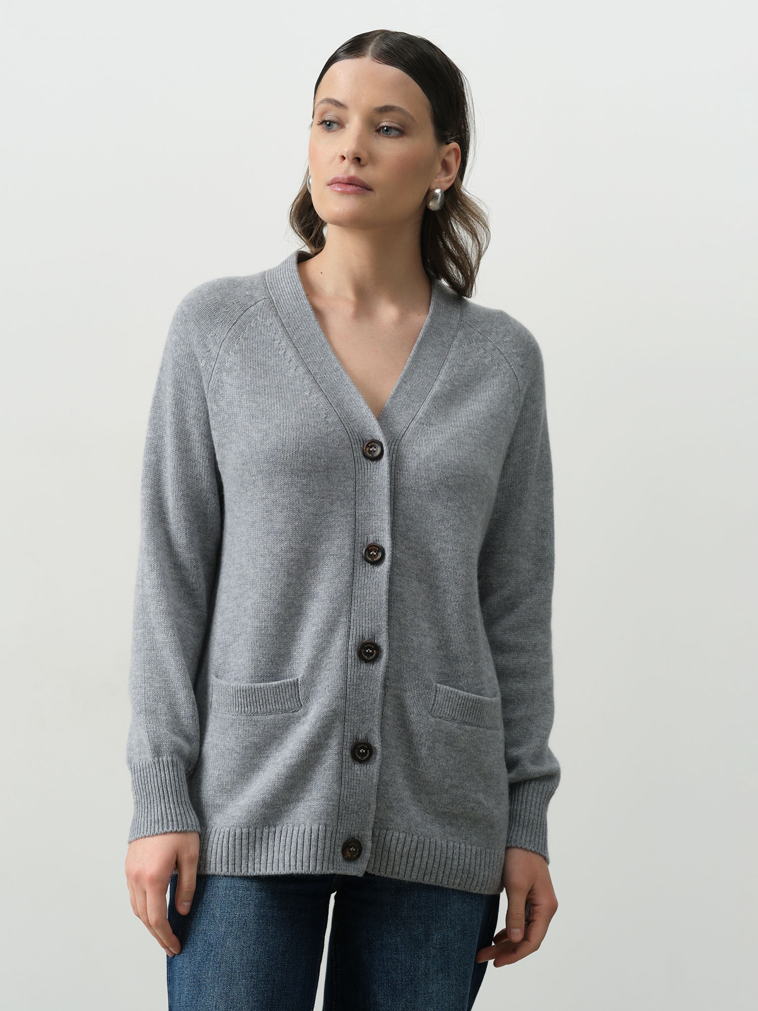 Модель выполнена с V-образным вырезом и застёжкой на пуговицы. Классический крой и минималистичный стиль делают кардиган универсальным элементом базового гардероба.